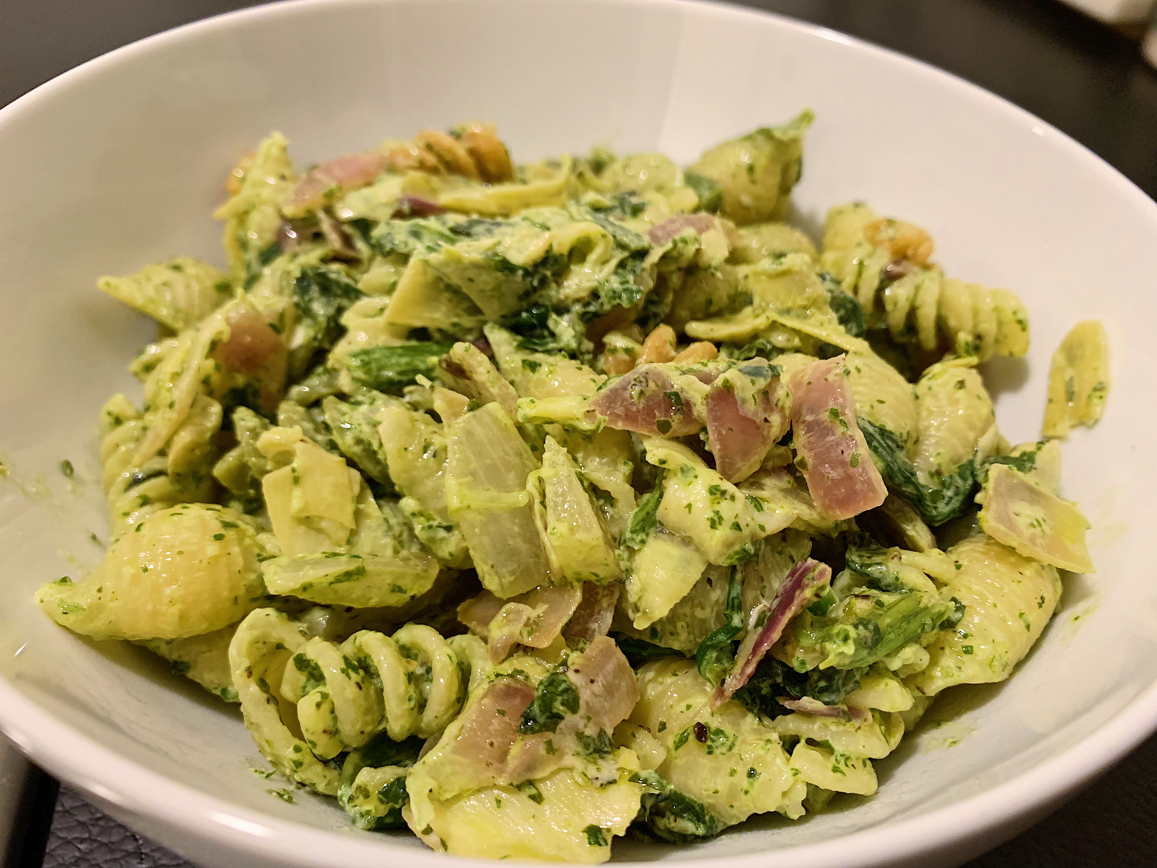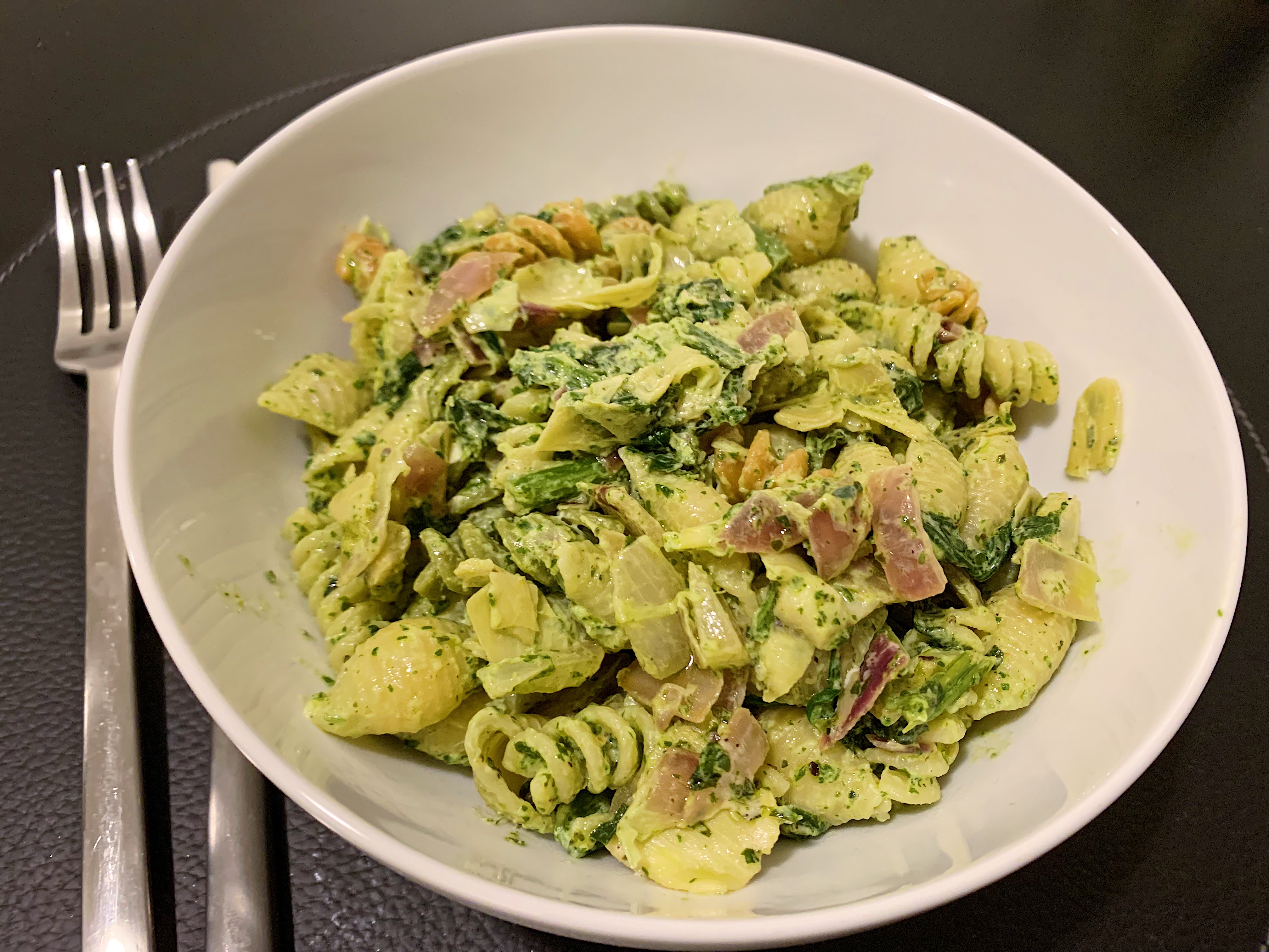 It’s Monday, I had to work late, and then it downpoured on me on my way home when I didn’t have an umbrella! This called for a quick, easy, and comforting meal—Vegan Creamy Pesto Pasta—using plenty of veggies, fresh basil, and vegan cream cheese.